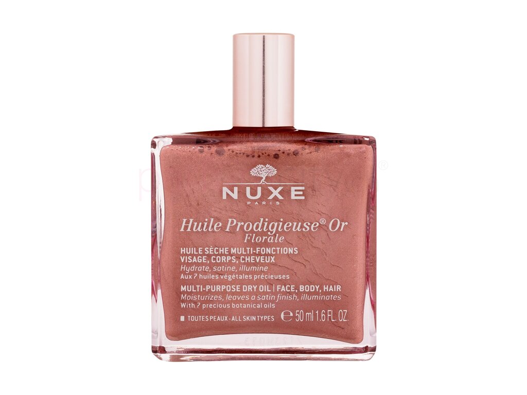 Im schimmernden Trockenöl NUXE Huile Prodigieuse Or Florale finden Sie 7 wertvolle Öle und roségoldene Perlchen, die Ihre Haut, Haare sowie den ganzen Körper verwöhnen, indem sie ihnen perfekt Feuchtigkeit spenden und sie nähren. Darüber hinaus verleihen sie ihnen einen sinnlichen blumigen Duft und einen goldenen Schimmer.