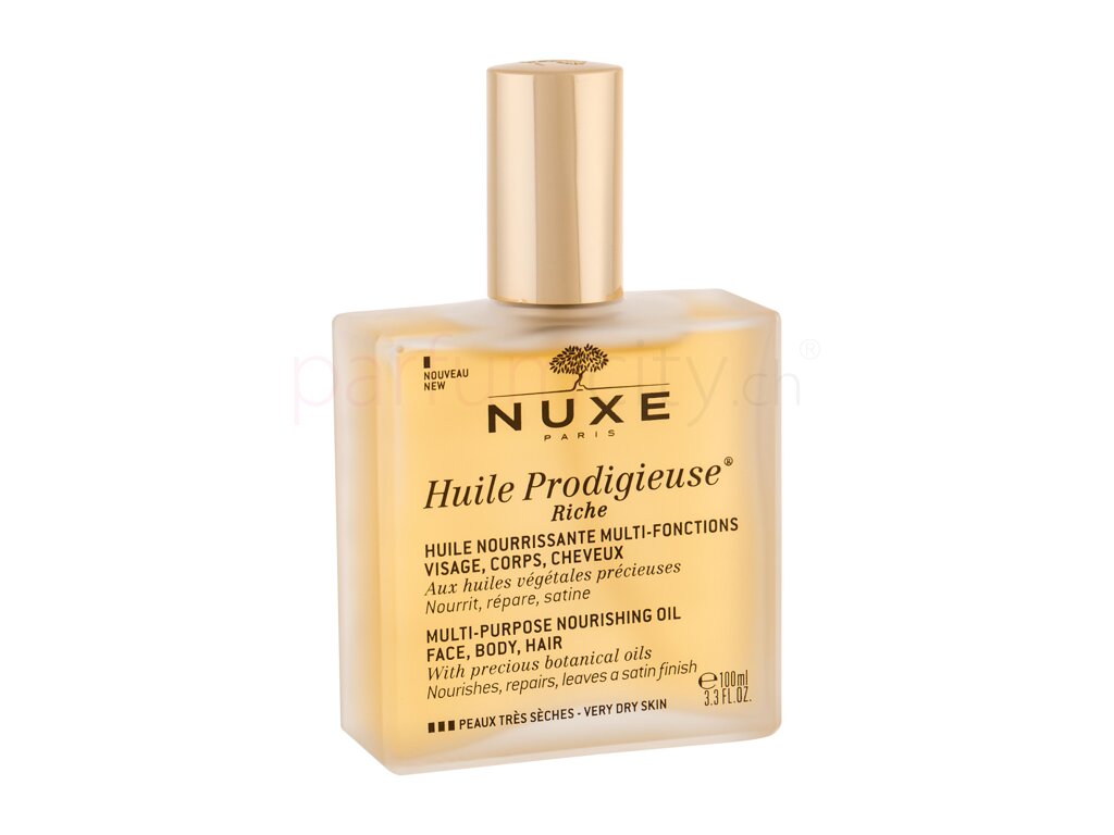21.00 CHF / 100 ml, inkl. MwSt.Das multifunktionelle Öl NUXE Huile Prodigieuse Riche ist ein wahres Allroundtalent: Das Öl bringt der trockenen Haut sowie dem Haar ein absoluter Komfort, indem es diese mit Hilfe der Mischung aus 7 wertvollen Ölen tiefenwirksam nährt, hydratisiert und regeneriert.